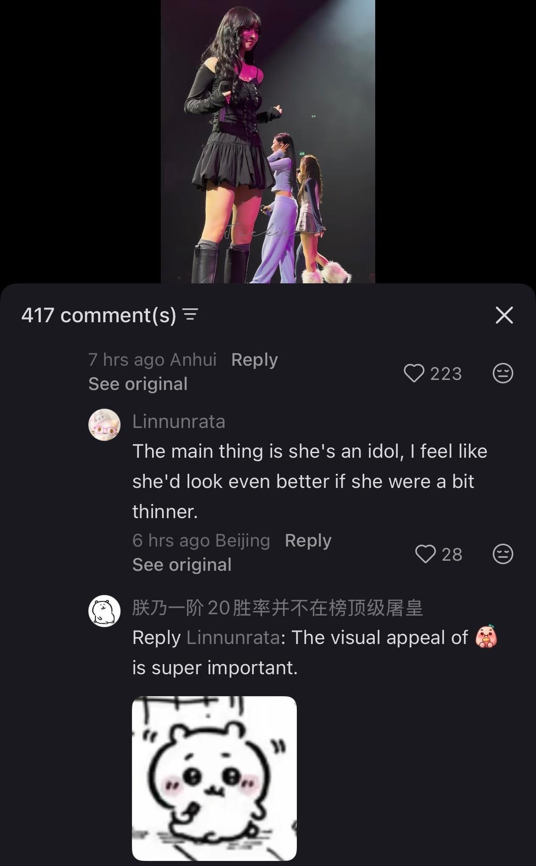 unfortunately even with the skinniest idols, they continue to judge and scold female idols if they aren’t to their standard of skinny. it’s a bit dystopian and the screenshots u see above were the “tamest” ones i could find🤦♀️.