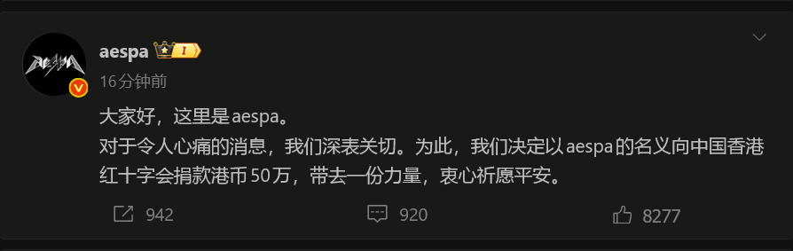 We are deeply concerned about this heart-wrenching news. To this end, we decided to donate HKD 500,000 to the Hong Kong Red Cross Society in the name of aespa to bring some strength and sincerely pray for safety.