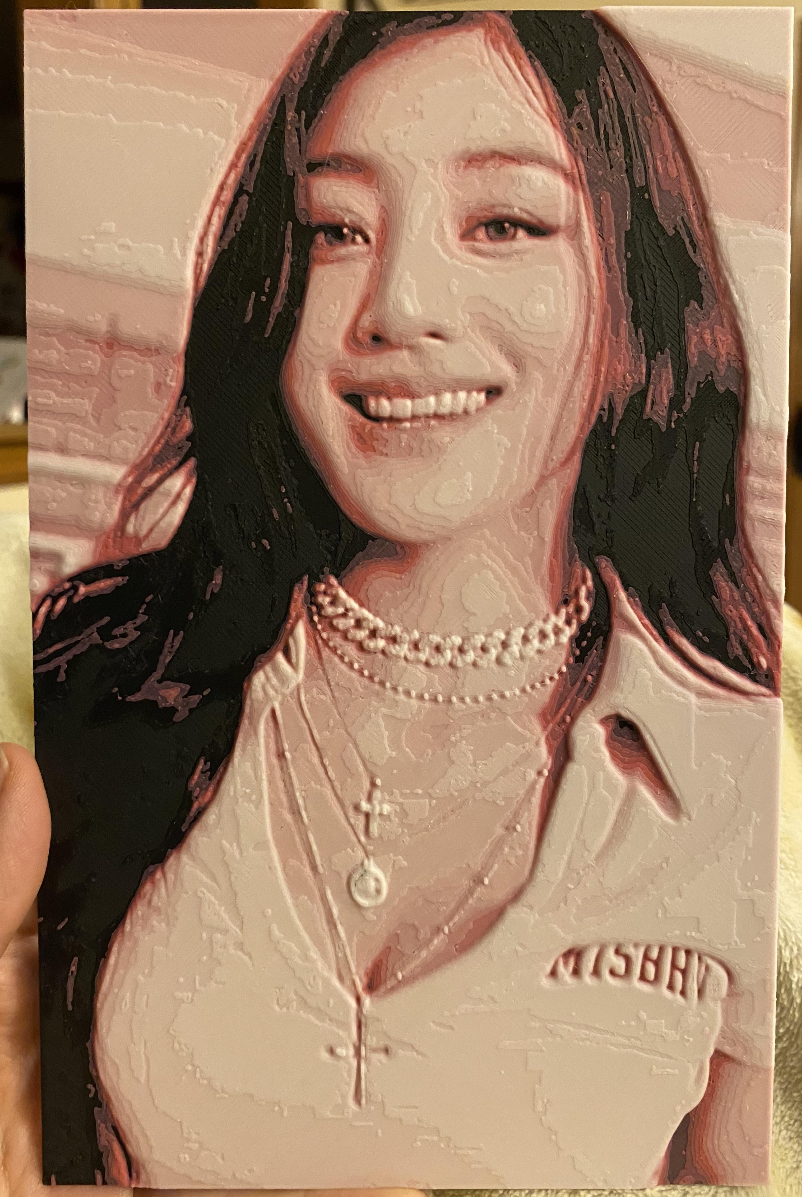 I recently got a 3D printer and I’m thinking of using it to make freebies for the This is For tour (I’m going to the Philadelphia stop). I made this image of Jihyo using a program called Hueforge. It’s too big for a freebie but I think the final result looks pretty nice!