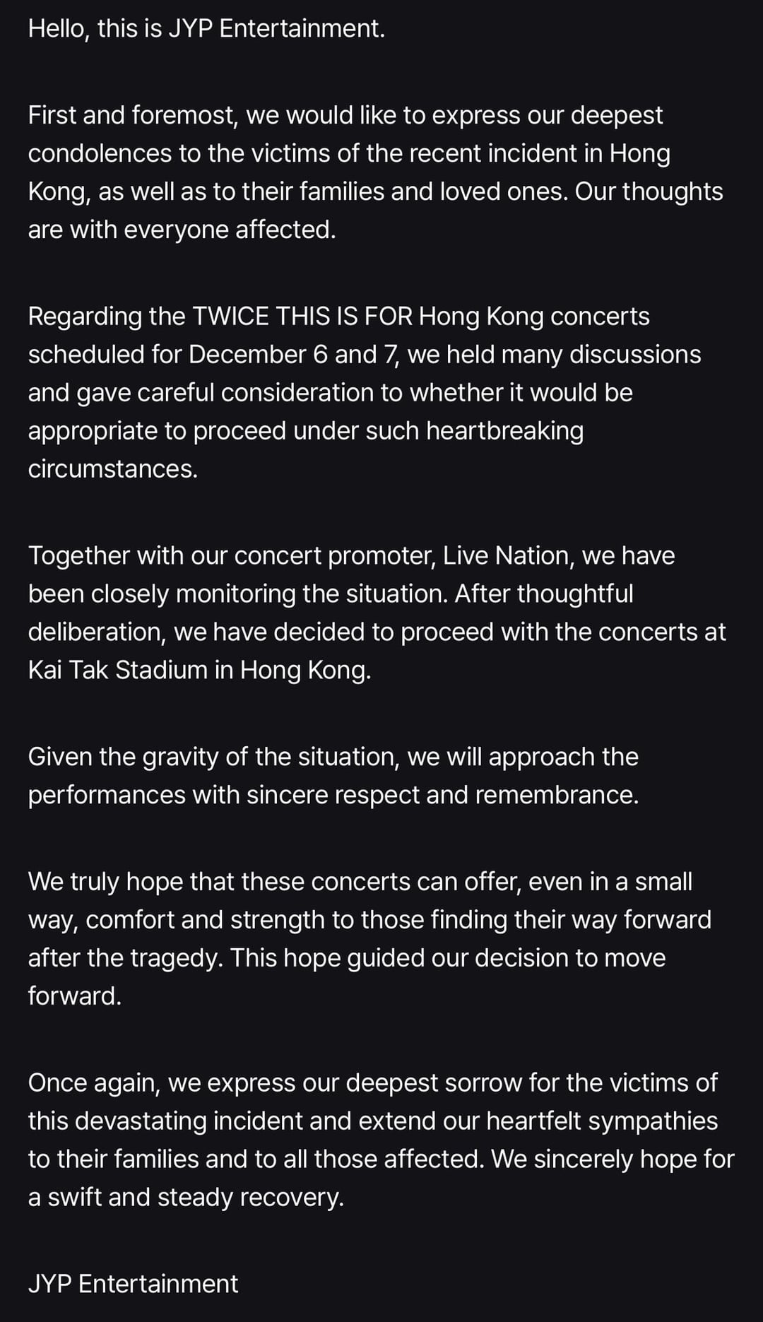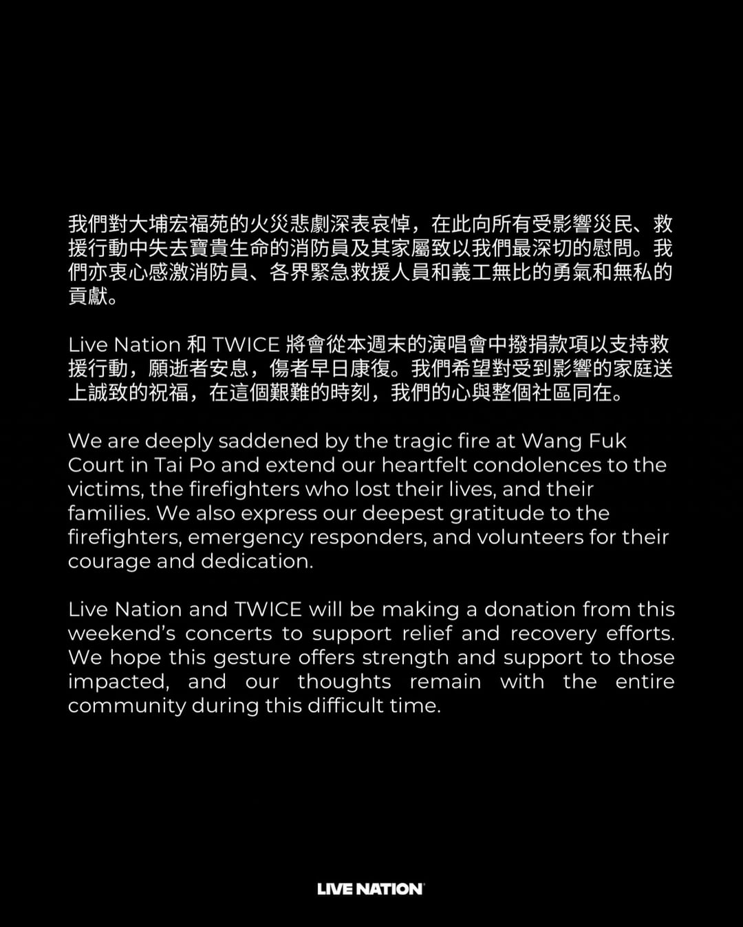 TWICE and Live Nation will also be making a donation from the proceeds of the concerts in HongKong this weekend to support relief and recovery efforts for those affected by the fire tragedy.