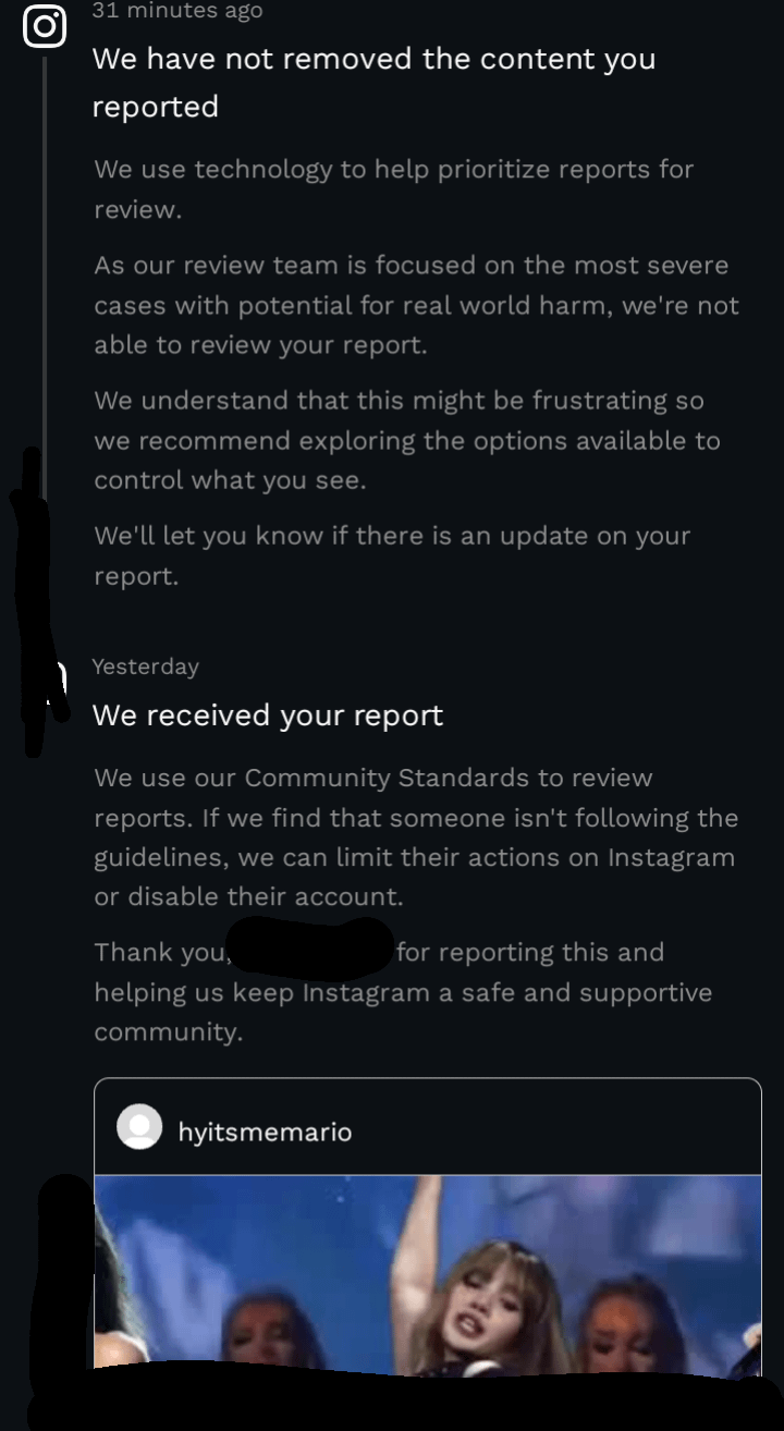 Hi. First post here. I reported this user for the fact that the post in the screenshot is deepfake 🌽 of Lisa Manoban, and the guy LITERALLY tagged her. It's not in the frame here, but the right side is Lisa, oiled up in some tiny bikini she obviously never wore, and the left side is Lisa in a coat and virtually nothing else, and the two white girls behind her are performing an "act". Well, I reported it, and the app tells me this. It won't remove it, it wasn't able to review it either, and to basically "figure out how to see less of it instead." What part of this is okay? Am I missing something?