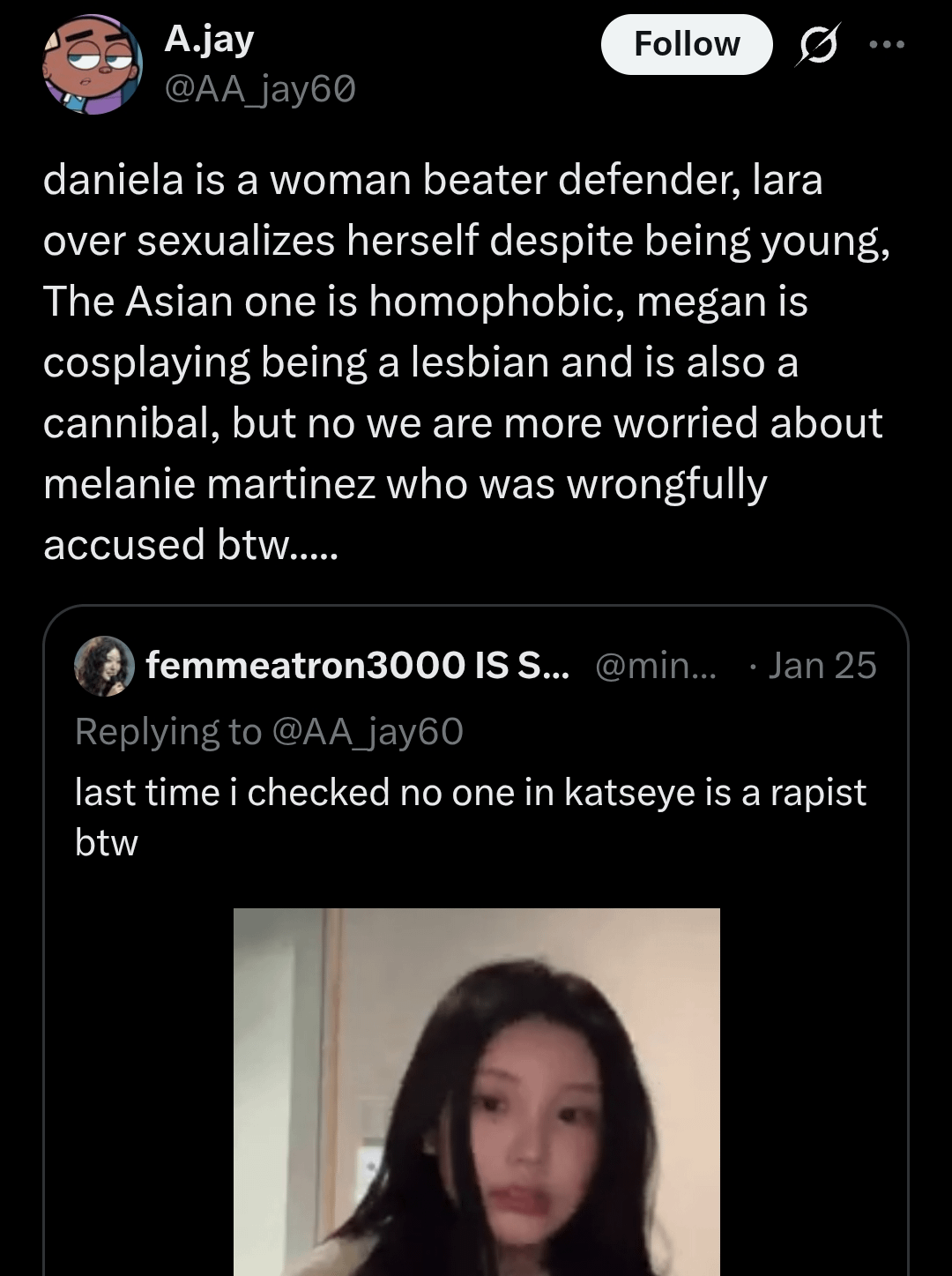 Daniela is not responsible for Carti’s actions, and Woojin is not responsible for Tory Lanez's; nobody deserves to be the punching bag of an internet that suffers from selective amnesia. I support both groups, but I’m fed up with the double standard. If you’re going to demand "responsibility," demand it equally from everyone.