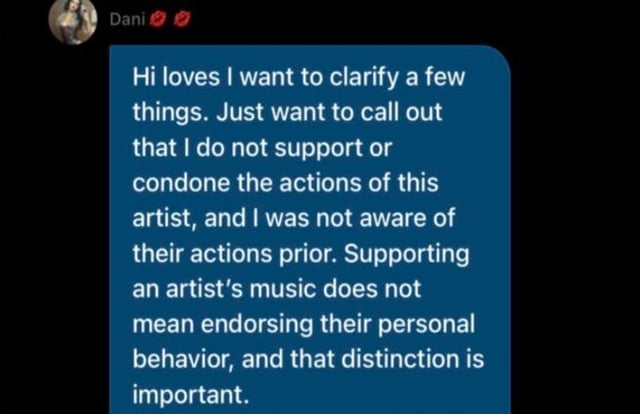 On Weverse, she clarified: "I do not support or condone the actions of this artist," stating that she was not aware of his previous actions. To be honest, I recognize that she might be lying, since when you’re a big fan of an artist, it’s hard not to know about their controversies. However, many of us overlook this and support the art separately from the artist. From my experience, having a song pull you out of an emotional void does not mean you endorse the personal behavior of the author.