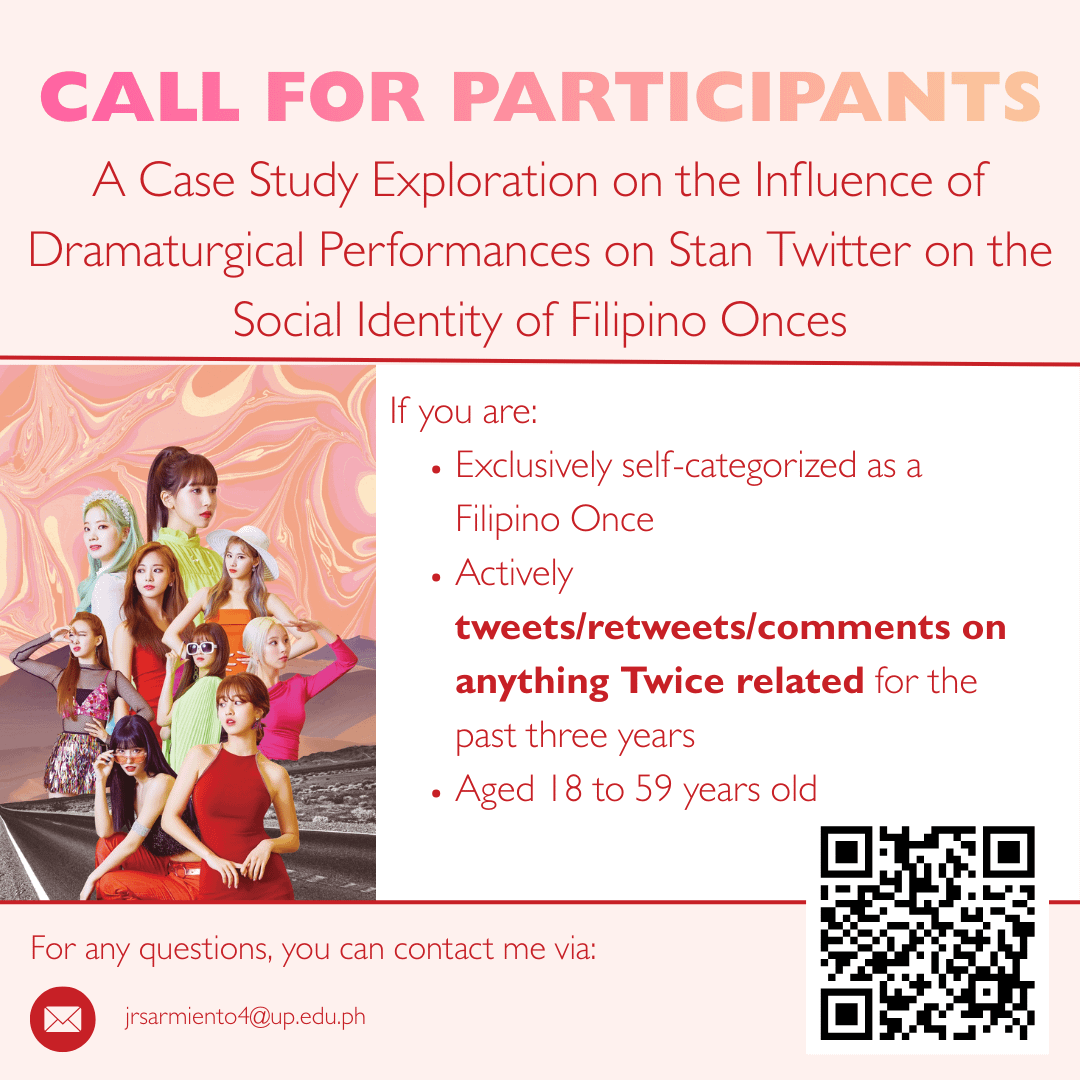 I am currently conducting my undergraduate thesis, entitled: “A Case Study Exploration on the Influence of Dramaturgical Performances on Stan Twitter on the Social Identity of Filipino Onces.”