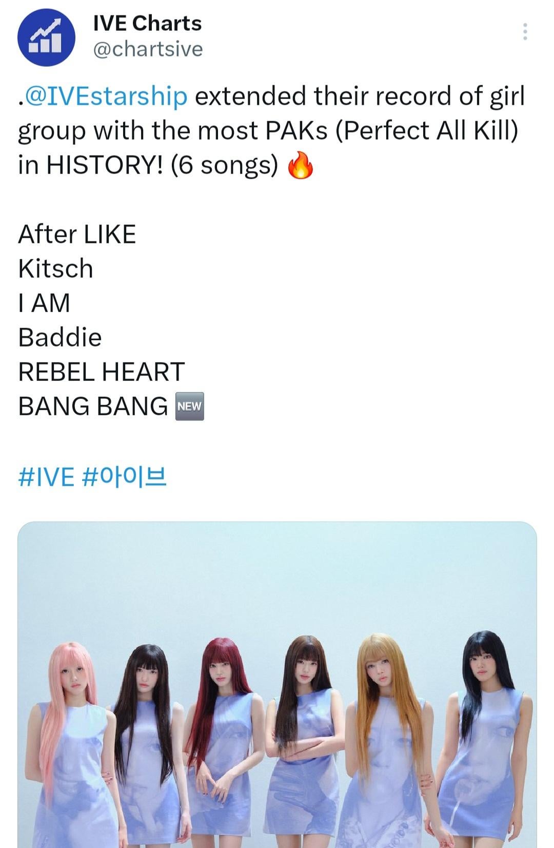 IVE now holds the record for the most Perfect All-Kill certified songs by any group, with a total of six songs tying BigBang according to iChart (The only and first list that grants the record) and none ever kpop group to got it in consecutive years.