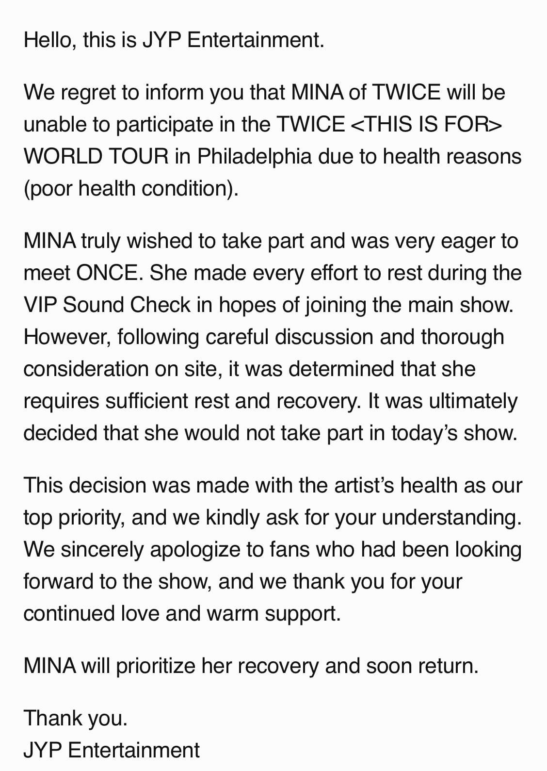 260225 FANS Update – MINA to be absent from TWICE <THIS IS FOR> in Philadelphia absent fans FORgt ltTHIS mina Philadelphia Twice update