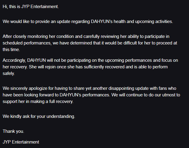 Home»Twice»Dahyun»260325 – Notice regarding TWICE DAHYUN’s Health and Upcoming Schedule