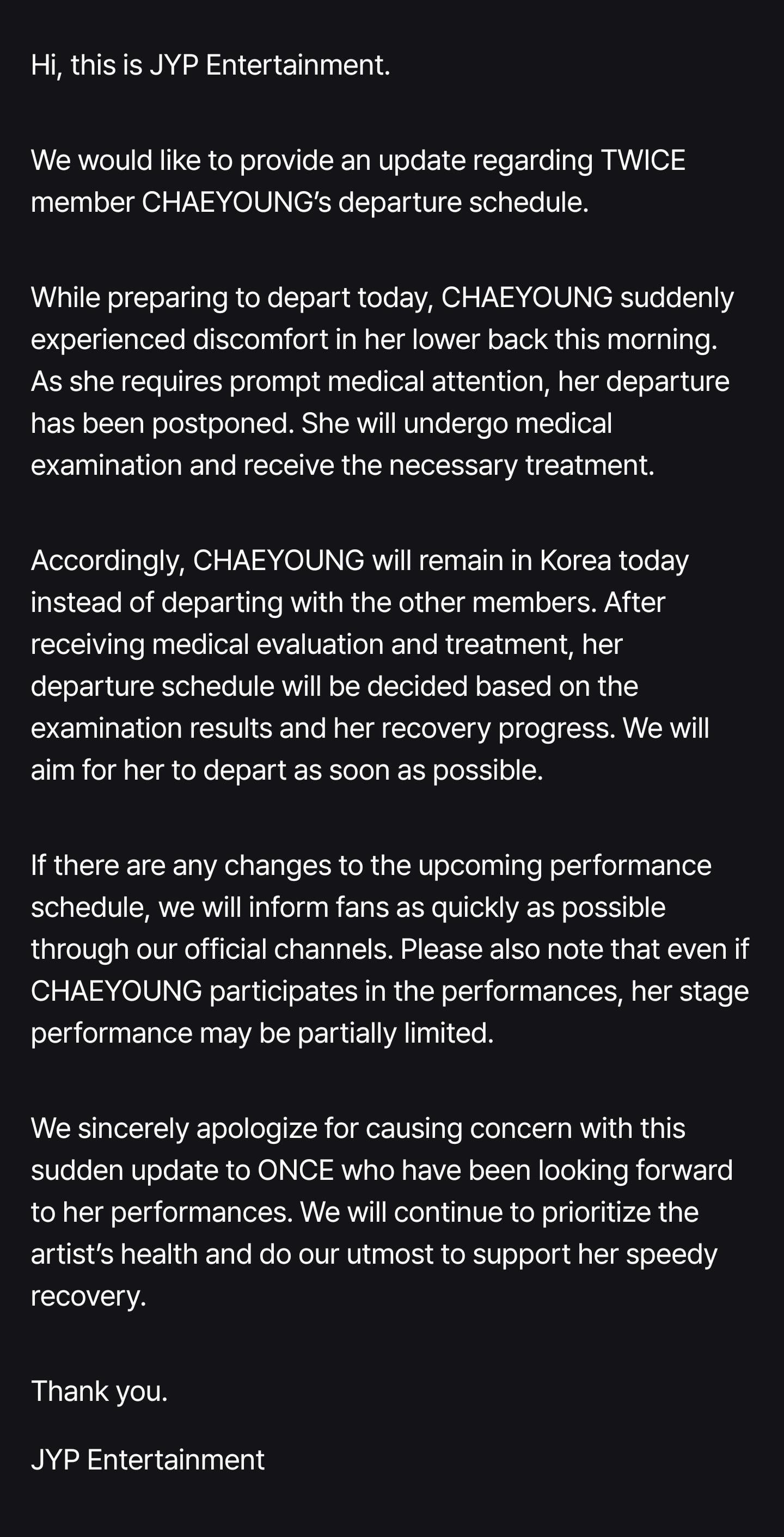 Home»Twice»260326 TWICE FANS Update – Notice Regarding TWICE CHAEYOUNG’s Upcoming Schedule