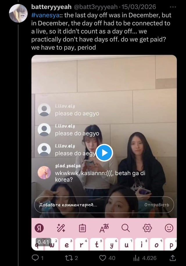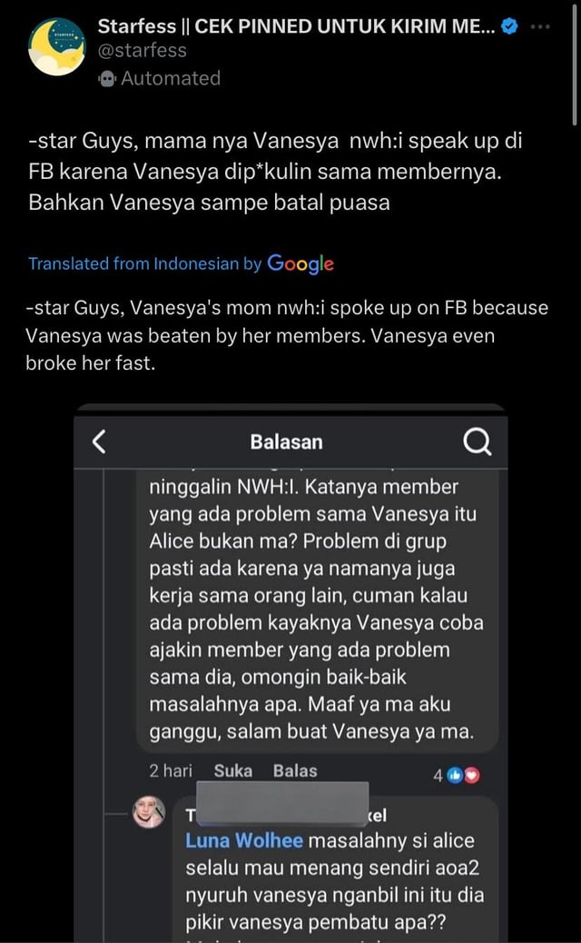 These last days, fans have been talking about recent comments made by Vanesya's mother on Facebook where she claims that Vanesya is being mistreated and bullied by other members of the group (Screenshots ). Vanesya clarified that nothing was happening between her and Alice (who was mentioned as the alleged perpetrator), but fans don't know what to think since the company is known for denying everything, taking over their socials and not assuring the members safety.