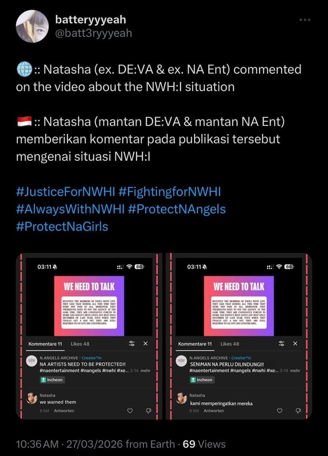 In the middle of March, four members of group NWH:I (Nina, Seungjoo, Via and Vanesya) did an Instagram Live claiming that the company isn't paying them and the members themselves are the ones who pay for everything, including the things for the new trainees; that they don't get absolutely no rest days and no proper sleeping; the had a heater, but now the new trainees have it; they don't a decent schedule for practice and have to do it with DNA (co-ed group under the company), now they'll have to do this with N.Angels, XENIX=ON and 'Na Girls' (28 people for who they have no money).