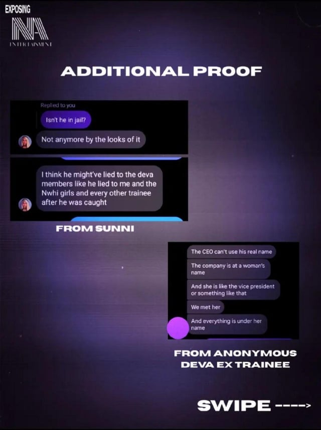 They changed company names to what is now "NA Entertainment" and were planning to debut a global group named DE:VA. After stirring, once again, controversy over the CEO's investigation case, one of DE:VA's members claimed that the CEO was in prison, but he was not. DE:VA members, except Nina and Alice (now NWH:I's members), left the company in 2024.