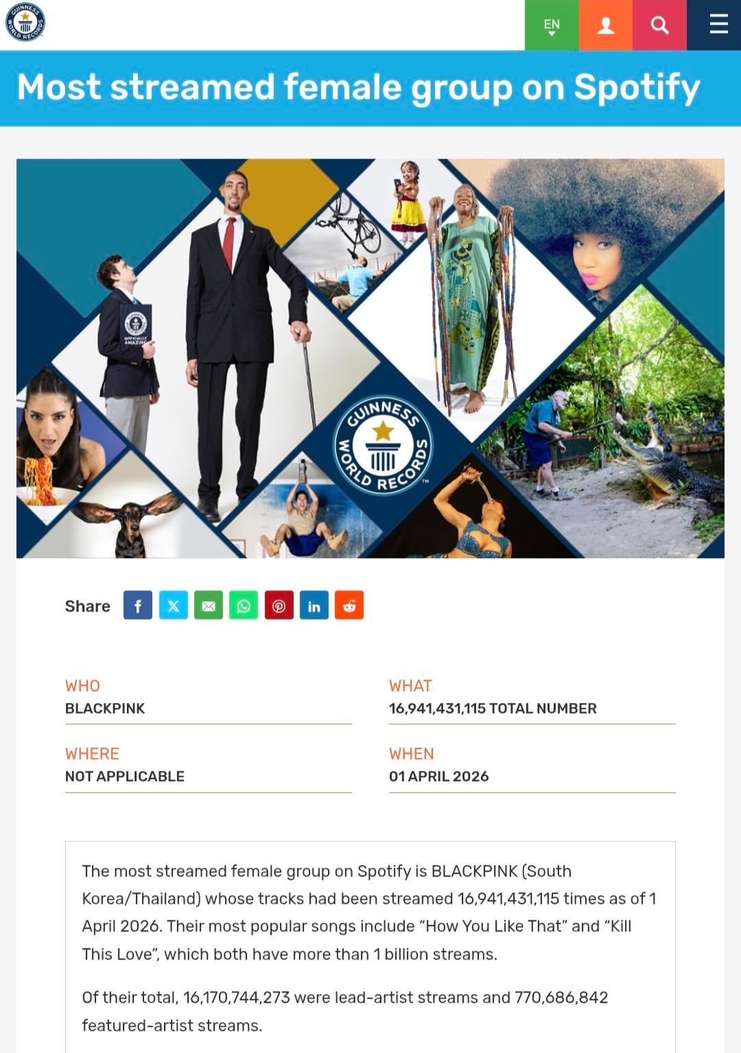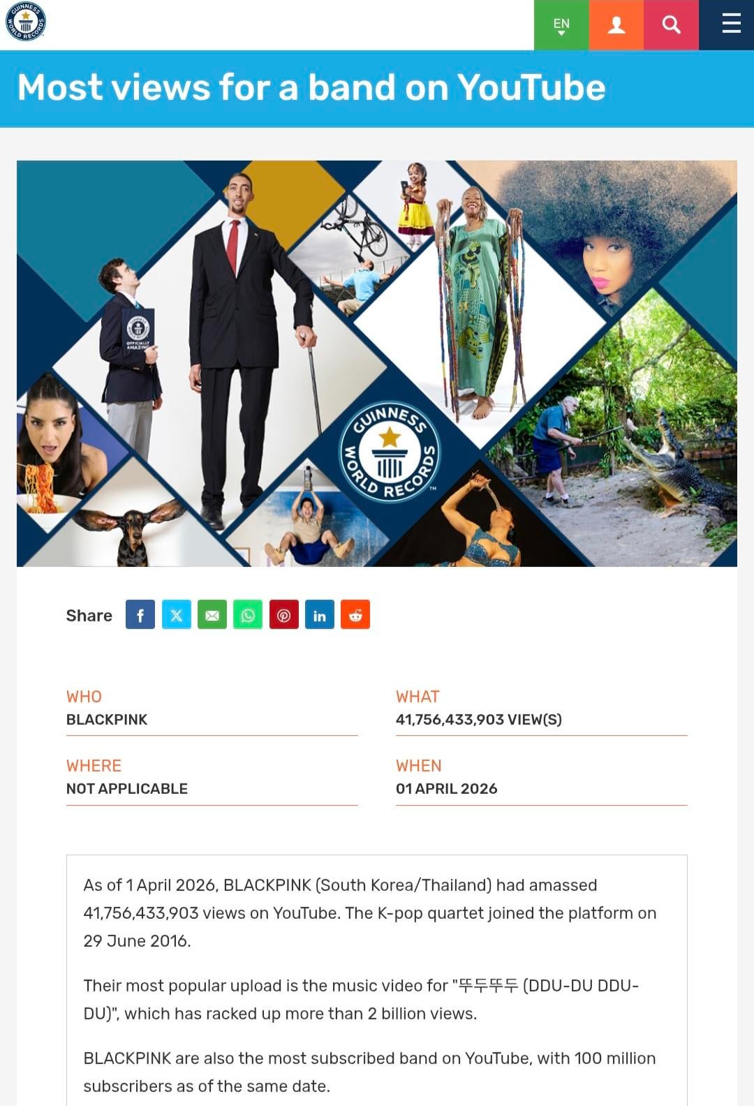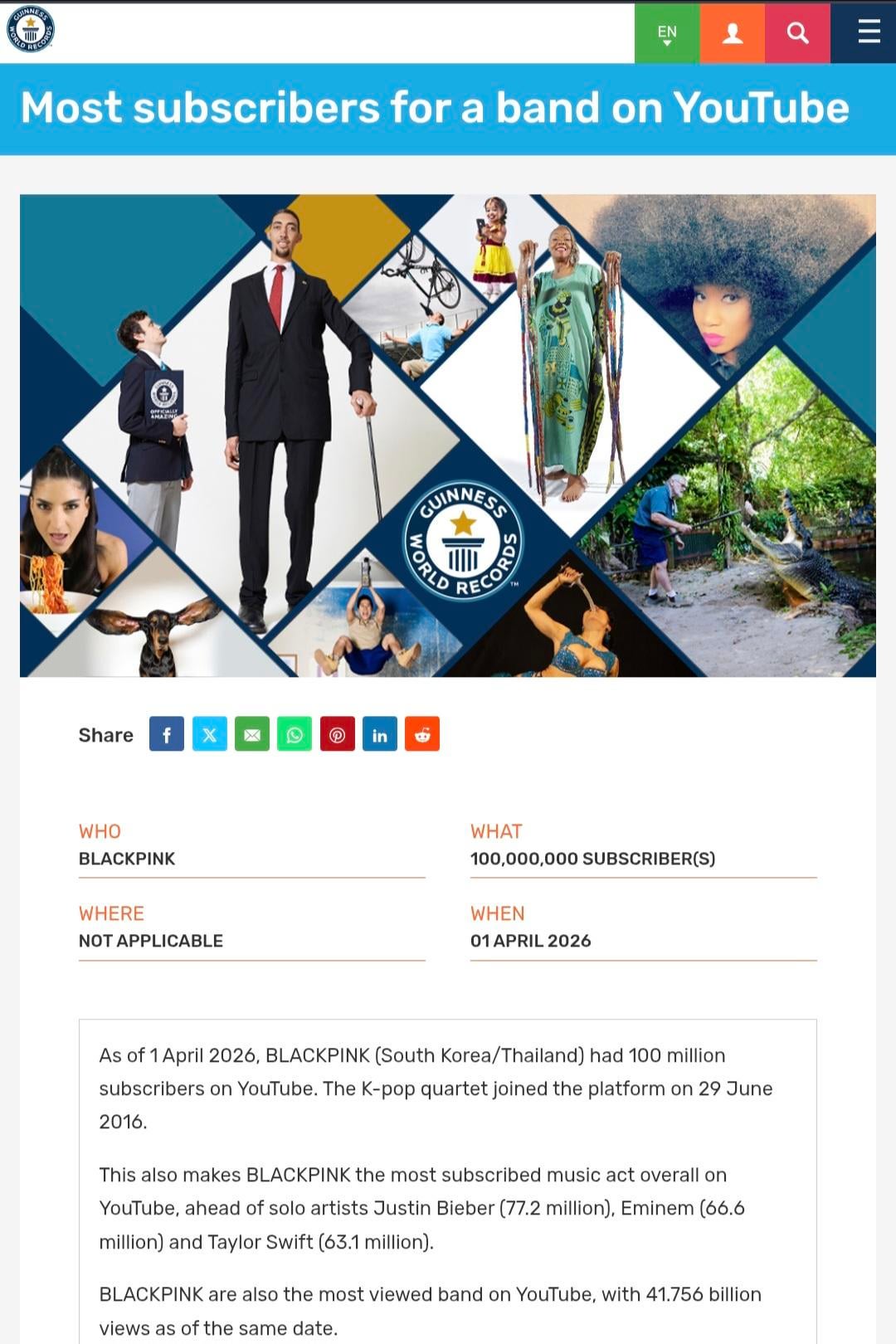 260407 BLACKPINK has set 3 new Guinness World Records for ‘Most subscribers for a band on YouTube’, ‘Most views for a band on YouTube’ & ‘Most streamed female group on Spotify’!