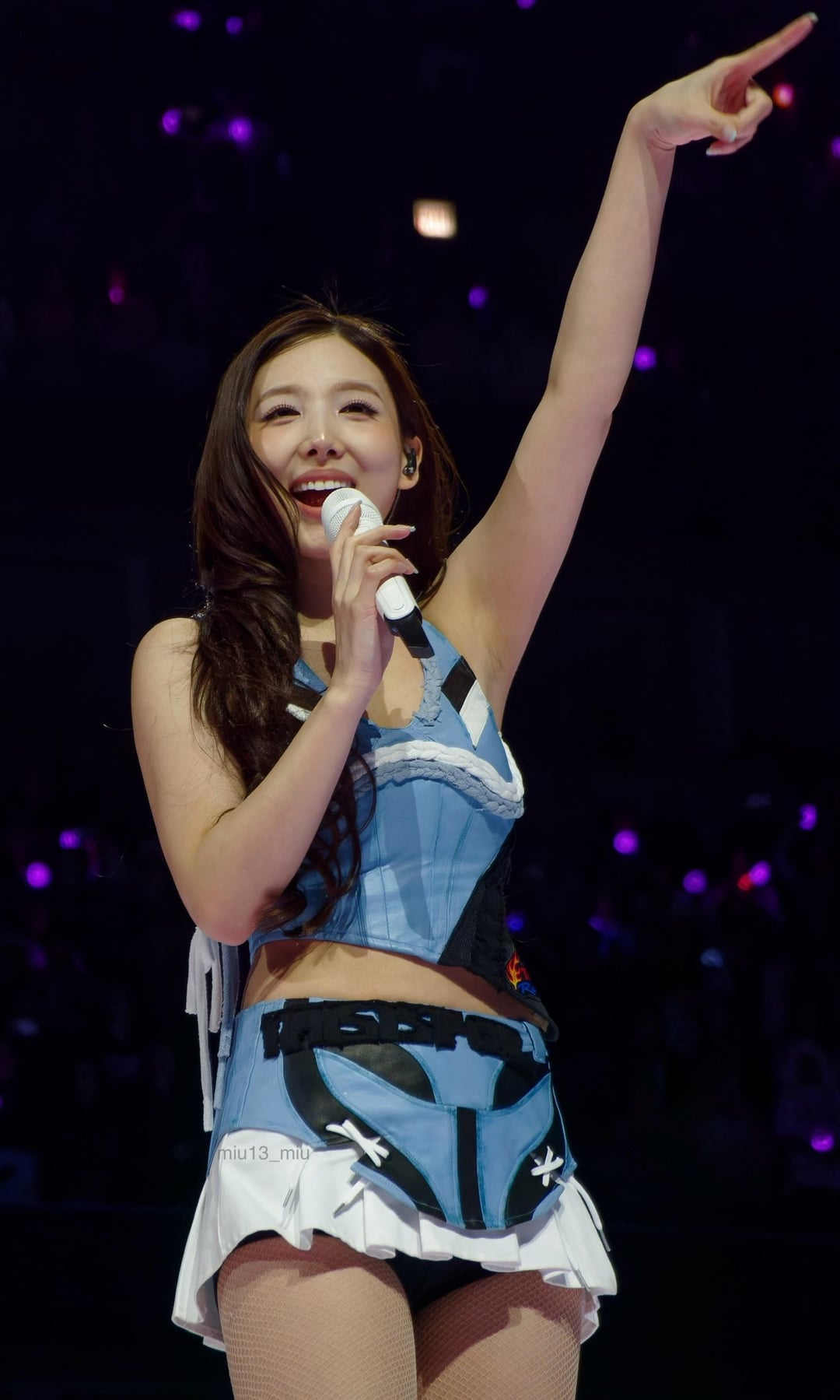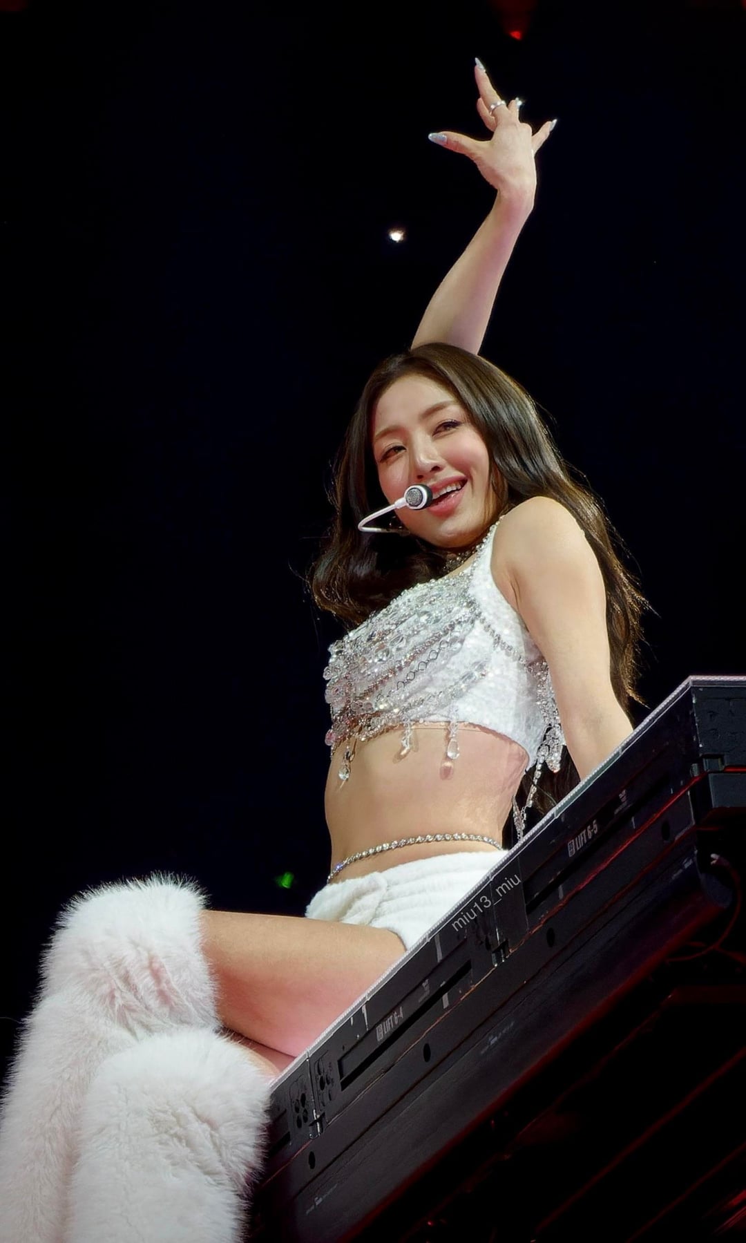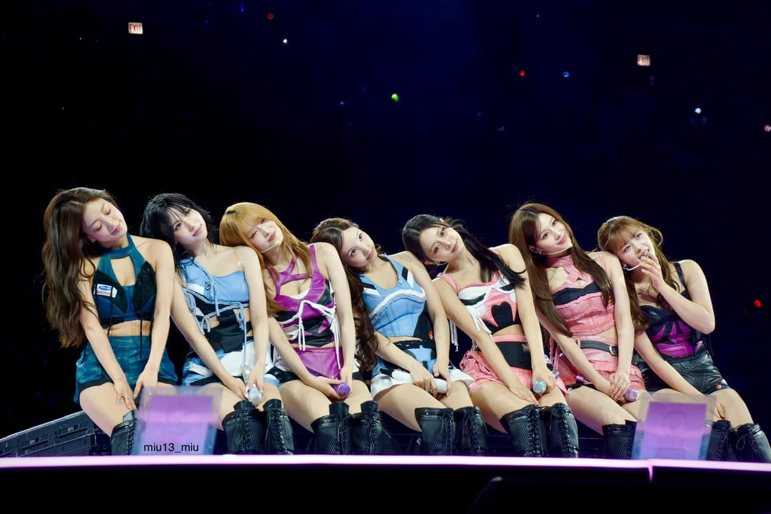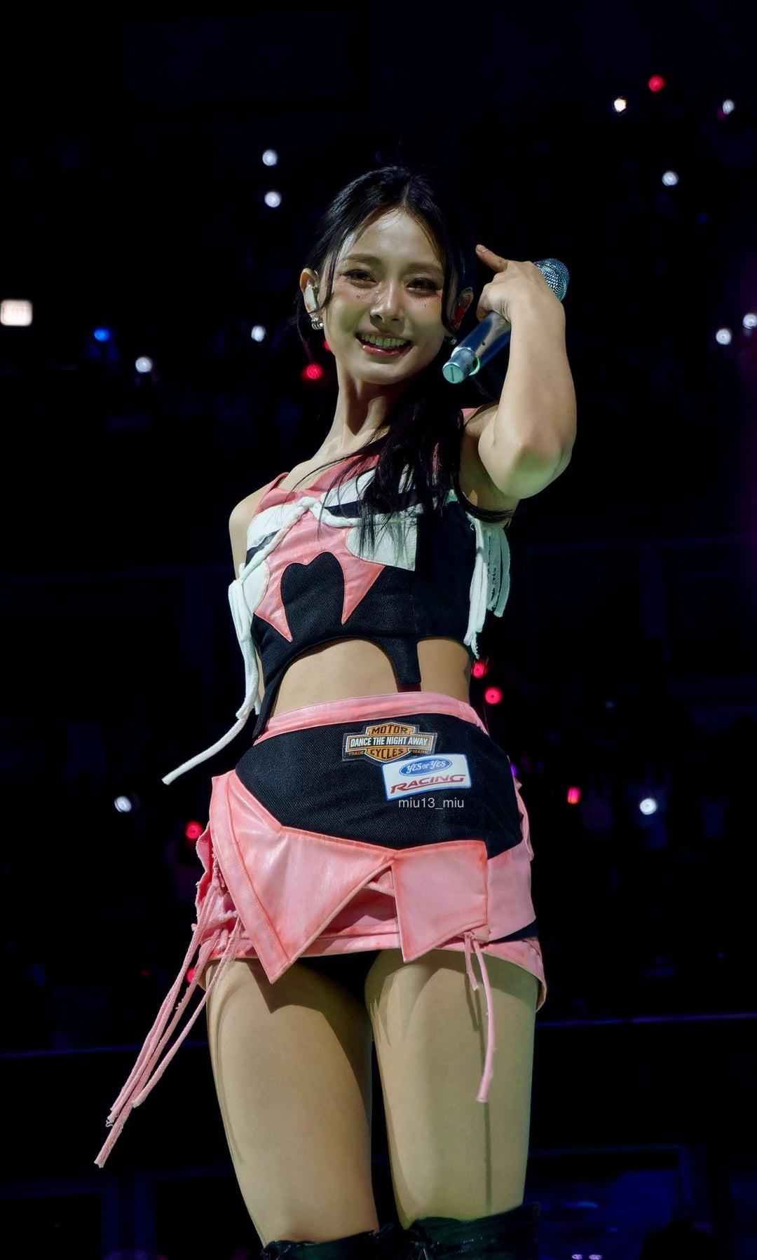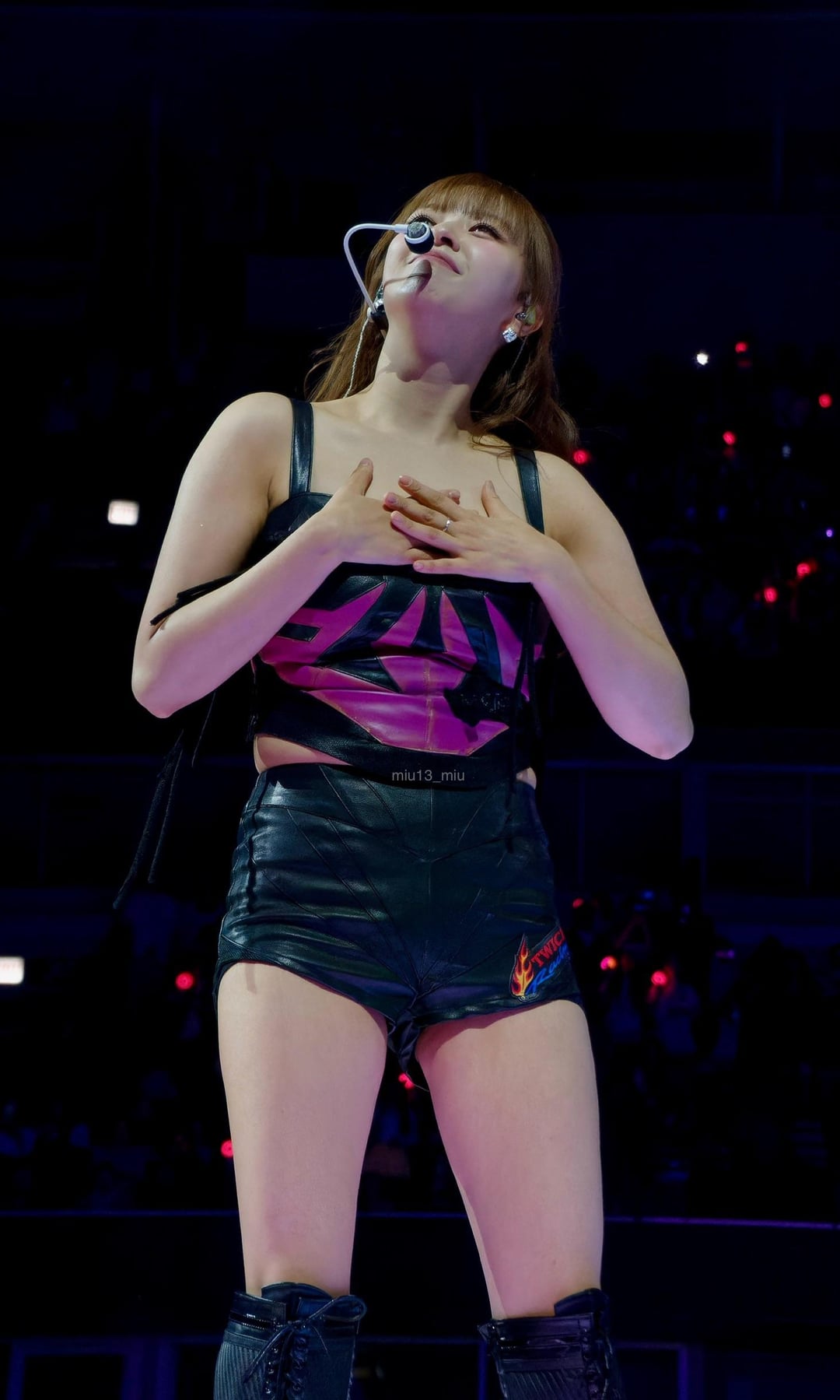 260409 prada Instagram Update – Prada Ambassador SANA wore a Prada burgundy chiffon dress layered over matching crepe de chine shorts, accented with a crystal belt, to perform during her TWICE’s World Tour THIS IS FOR.